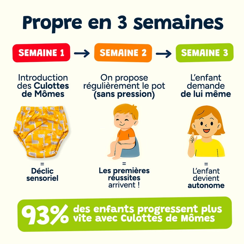 Vergeet maandenlange strijd! Met onze Les Culottes d'apprentissage is je kleintje binnen drie weken zindelijk. Zachte, comfortabele pants voor snelle, zorgeloze training.